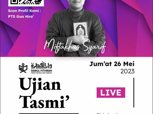 Alhamdulillah salah satu santri PTS (program tahfidz sanad) Darul Fithrah berhasil mentasmi’kan hafalan 30 Juz nya bill ghaib (sekali duduk) pada Ahad 19 2023 lalu, semoga Allah SWT menjaga hafalan beliau dan memuliakan nya dengan Al Qur’an. Aamiin.
